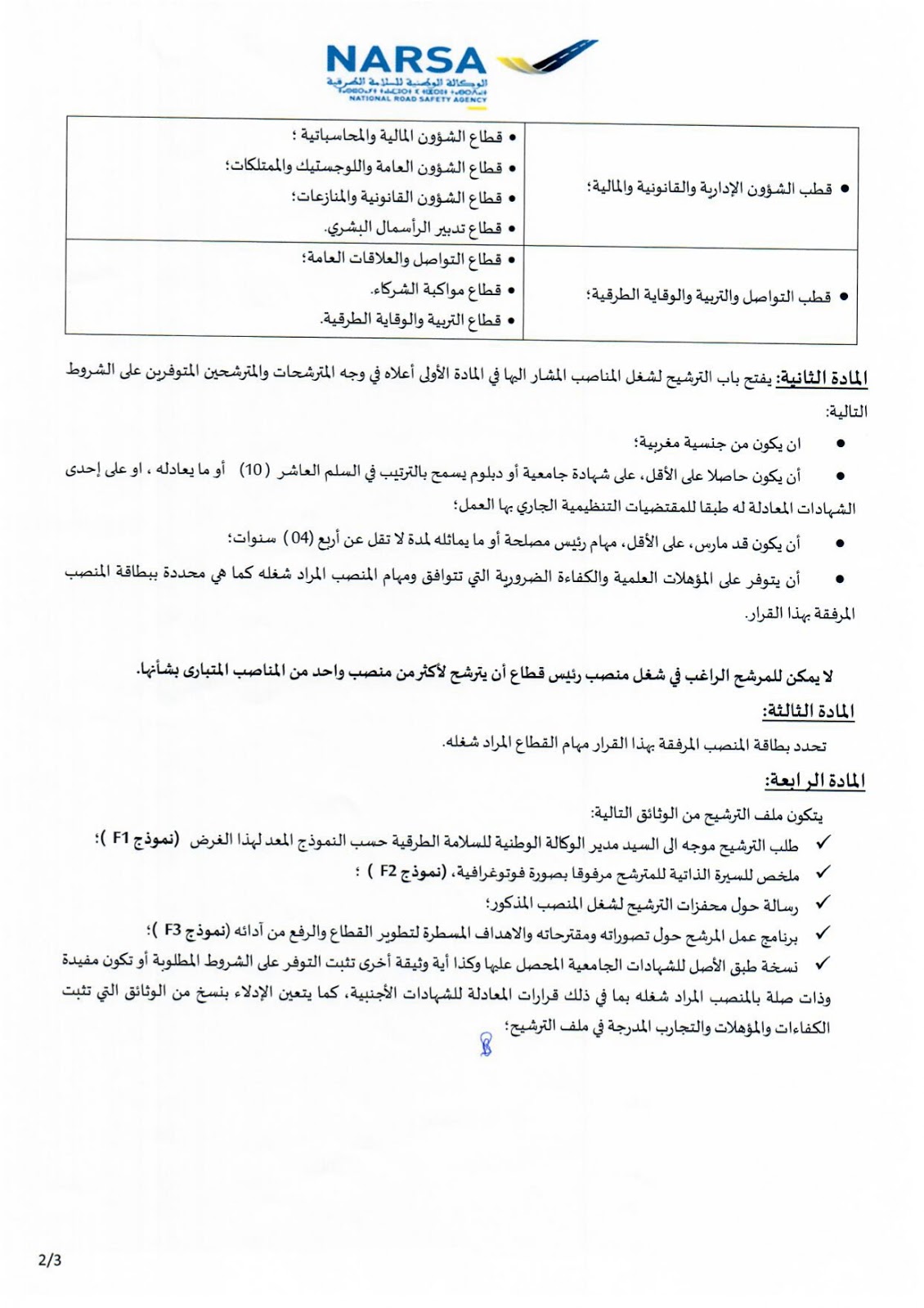 - سيعلن على نجاح المترشحات والمترشحين في هذه المباراة في حدود المناصب والتخصصات المتبارى بشأنها حسب الترتيب والاستحقاق على الموقع الإلكتروني للوكالة الوطنية للسلامة الطرقية www.narsa.ma وكذا بوابة التشغيل العمومي www.emploi-public.ma؛