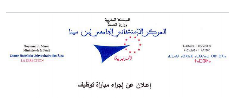 المملكة المغربيةوزارة الصحةالمركز الإستشفائي الجامعي ابن سينا المديريةإعلان عن إجراء مباراة لتوظيف أطباء من الدرجة الأولى (متخصصين) بالمركز...